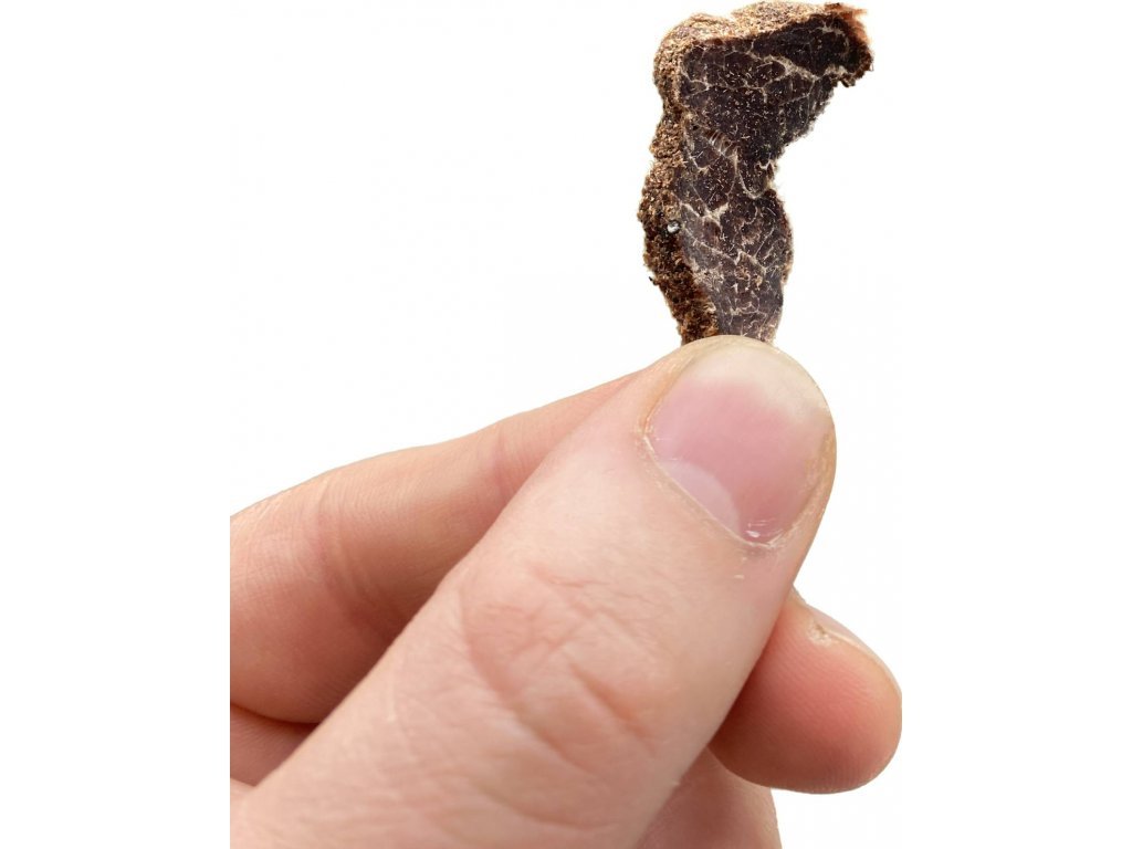 Sušené maso hovězí. Masný výrobek trvanlivý tepelně neopracovaný. 1 kg syrového masa = 0,3 kg sušeného masa. Bílý povlak není závadou. Skladujte 5-30 °C. Po otevření spotřebujte do 48 hodin. Datum spotřeby je 12 měsíců od data výroby.