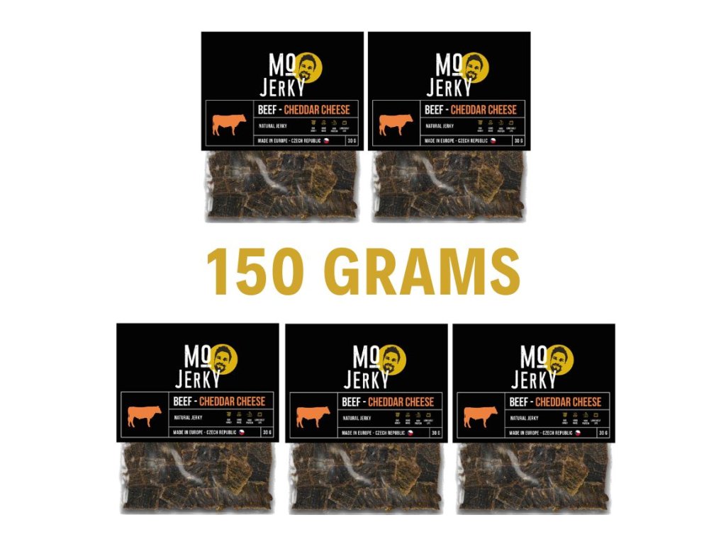 Ochutnejte naše nejprodávanější sýrové hovězí jerky! 150 g jerky za zvýhodněnou cenu. Dodáváme v praktickém 5 ks balení, ideální na cesty, do práce nebo ke sportu. Dopřejte si víc chuti a kvality s naším výhodným balením!